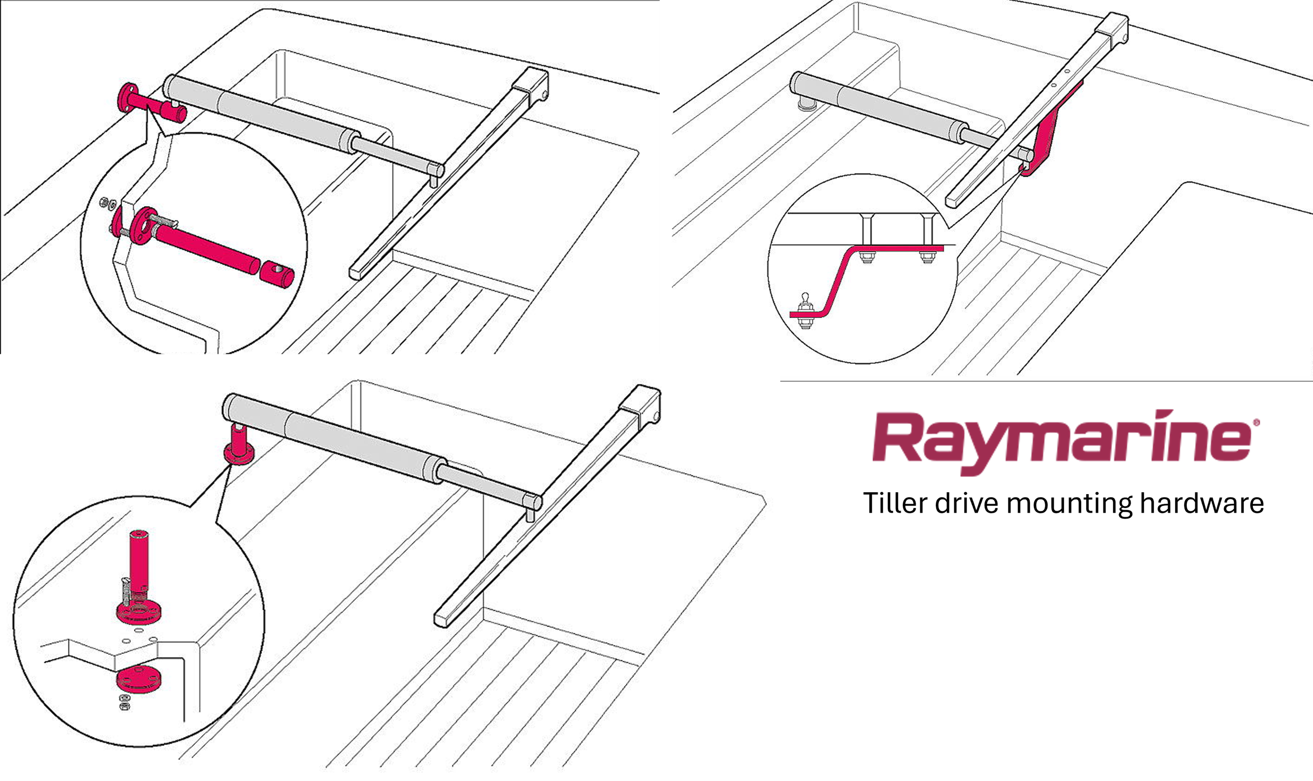 Since the original Raymarine fittings, the pin and brass socket, are used, any mounting bracket by those brands can be used. The tiller drive rod extension cannot be re-used.